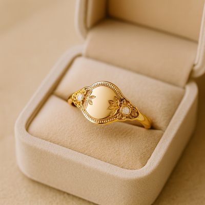 A marquise signet with delicate leaf relief and a quiet, mirror-like glow. Versatile, meaningful, and crafted to endure your every phase.